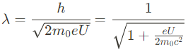 전자 현미경의 경우, 가속 포텐셜은 일반적으로 수천 볼트 정도이며, 전자가 빛의 속도보다 매우 작은 속도로 움직이게끔 한다. 10 kV의 가속 포텐셜에서 작동하는 SEM은 빛의 속도에 약 20% 정도이며(파장은 12.3 pm 정도), 200 kV로 작동하는 일반적 REM은 빛의 속도에 약 70% 까지 전자의 속도를 끌어 올린다(이때 파장은 2.5 pm 정도). 그러므로 우리는 상대론적 효과를 고려해야 하며, 전자의 파장은 아래와 같이 수정되어야 한다.