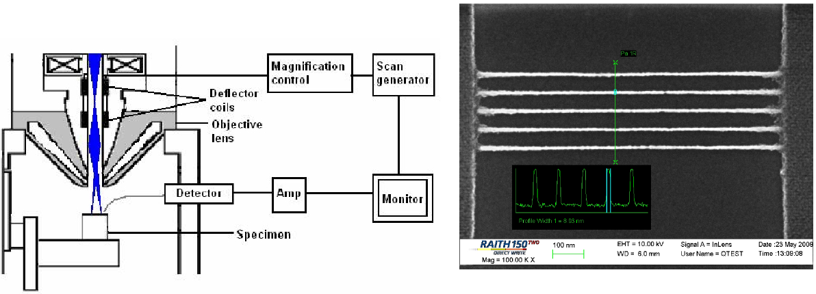 nm 스케일 패터닝을 하는데 있어 EBL의 강점은 전자의 짧은 파장으로 부터 온다. 움직이는 전자의 파장은 de Broglie 방정식에 따라 주어진다.