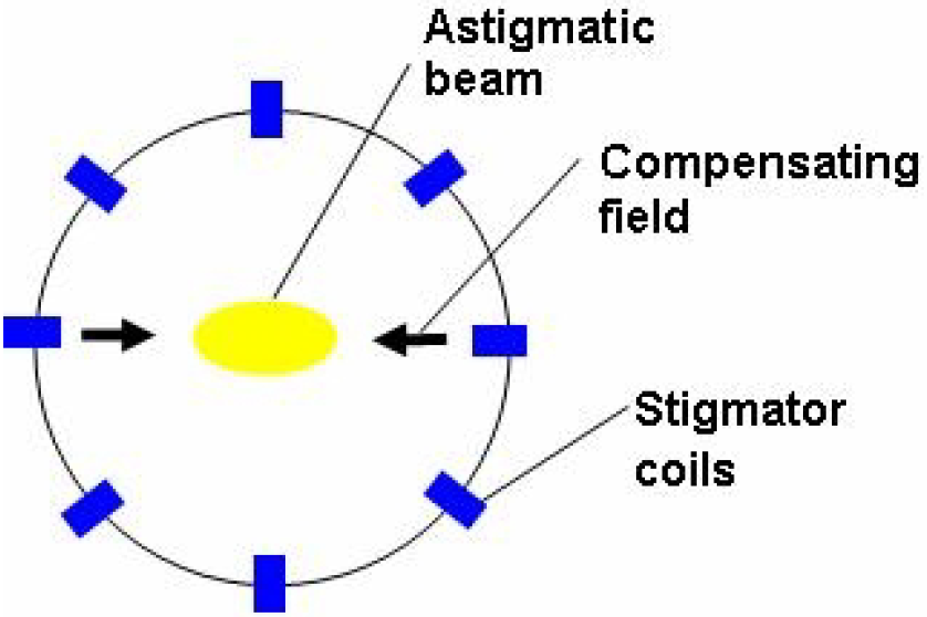The electromagnetic lenses used in a SEM are not always perfectly symmet-rical. A converged beam would appear circular on the specimen provided the fields produced by the lenses were perfectly symmetrical. If not, then this results in streaking of image on both sides of focus. Even if streaking is not evident, astigmatism still needs to be fine-tuned to obtain high quality images.Objective lens astigmatism can be compensated by applying current dif- ferentially to a ring of stigmator coils around the objective lens. (refer Fig. 1.9)