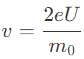 전자는 전기적 포텐셜 U에 의해 다음의 속도까지 가속된다.