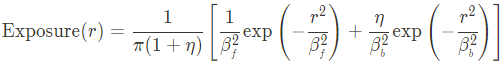 위 식에서 $r$은 beam position으로 부터의 radial distance, $\beta_f$는 forward-scattered electron range, $\beta_b$는 backward-scattered electron range 이다.