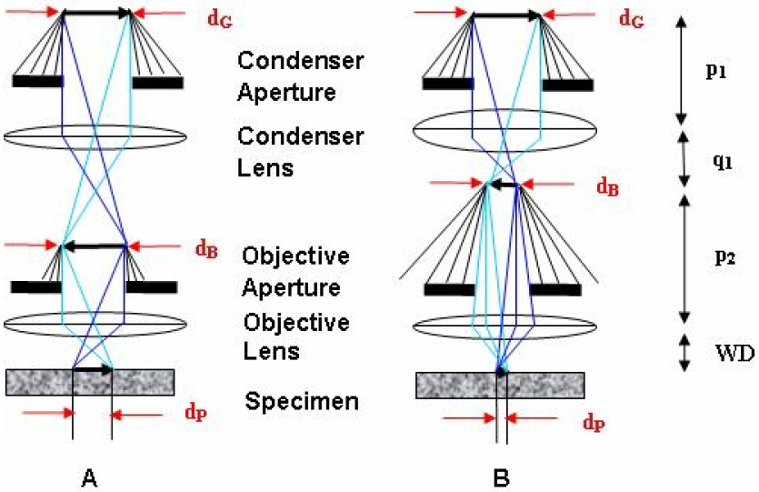아래 그림은 shows a simplified column with one condenser lens, an objective lens, and an aperture for each lens.