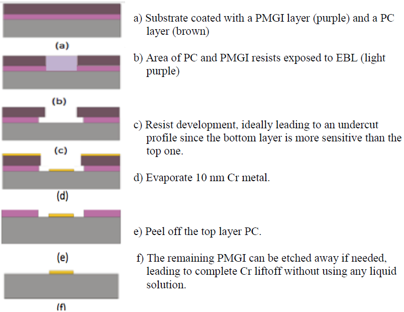 PMGI (polymethylglutarimide, SFG 2 S from MicroChem Corp.) is a very popular liftoff layer, so it is chosen for our purpose. Initial test showed that, as expected, PMGI didn’t detach from the silicon wafer since it adheres strongly to silicon; instead PC detached from the PMGI layer. This is acceptable for dry liftoff since the metal on top of the resist layer is removed when PC is peeled off. We expected to achieve an undercut profile because PMGI is a more sensitive resistant than PC (PMGI is exposed during the exposure of PC). We designed the process steps as shown in Figure 4-4.