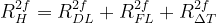 그러므로, 위의 방정식들을 다시 쓰면, $R_{_{DL}}^{2f}$, $R_{_{FL}}^{2f}$, and $R_{_{\Delta T}}^{2f}$는 아래와 같이 각각 쓸 수 있다.