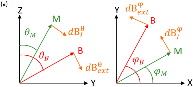 2: 우리가 수행하는 angular scan은 x-y plane, y-z plane에 국한된다. 그러므로 magnetization의 $\theta_{B}$ ($\phi_{B}$)성분에 대해서 볼 때는 external differential field의 $\phi_{B}$ ($\theta_{B}$) 성분은 무시해도 된다.