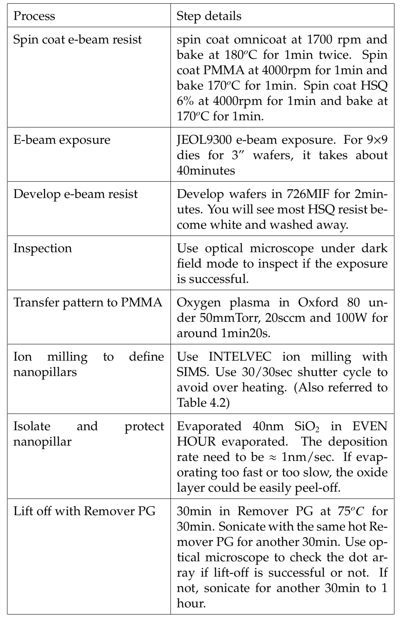 HSQ/PMMA lift-off nanomask에 thermal treatments 를 할 경우 lift-off yield가 심각하게 영향을 받는다. 그러므로 다음의 레시피를 면밀하게 따르는 것이 중요하다. 저자는 E-beam resists의 특성을 설명할 것이고 HSQ/PMMA lift-off nanopillar 과정의 레시피에 대해서 설명할 것이다. 저자는 PMMA와 HSQ에 가해지는 thermal annealing 시간을 줄이는 것이 lift-off yield를 증가시키고 sonication time을 줄이는데 효과적이라는 것을 찾아냈다. 일반적으로, PMMA는 E-beam exposure 전에 solvent를 확실하게 날려버리기 위해 170도 온도에서 15분 정도 bakign된다. 이 annealing recipe는 PMMA를 E-beam resist로 쓰고 E-Beam에 PMMA를 활성화 시키기 위한 것이다. 하지만 이 긴 시간동안의 baking을 통해, PMMA는 residue를 남기지 않고 완전히 제거되기가 어려워진다.