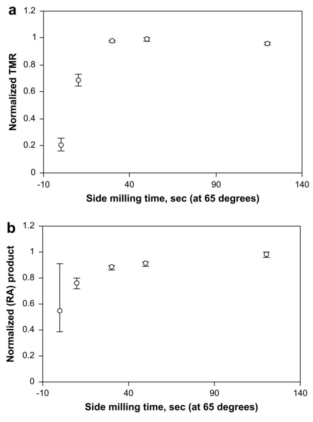 저자의 경우 보통 MgO에서 아래 CoFeB layer로 transition이 발생할 때 멈췄다. 이 transition time은 보통 1~2분 정도가 소요된다. ㄷ또한 side milling 역시 TMR performance에 도움을 주는 것역시 알아두는게 좋다. 하지만 Katine 연구팀[34]는 긴 시간의 side-milling은 edge damage를 유발하여 스핀밸브 센서의 GMR 성능을 감소시킨다는 것을 발견하기도 했다.