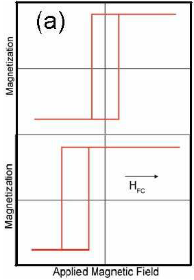 이 Exchange bias는 Meiklejohn과 Bean에 의해 처음 발견됐는데, Co molecule을 공기환경에 놔두면 자연산화가 발생하며 CoO (= AFM)를 생성한다. 이 상태에서 field를 건 상태에서 77K로 cooling을 하게되면, Co와 표면의 CoO끼리의 교환상호작용이 발생하여 아래의 그림처럼 uniaxial like 해진다.