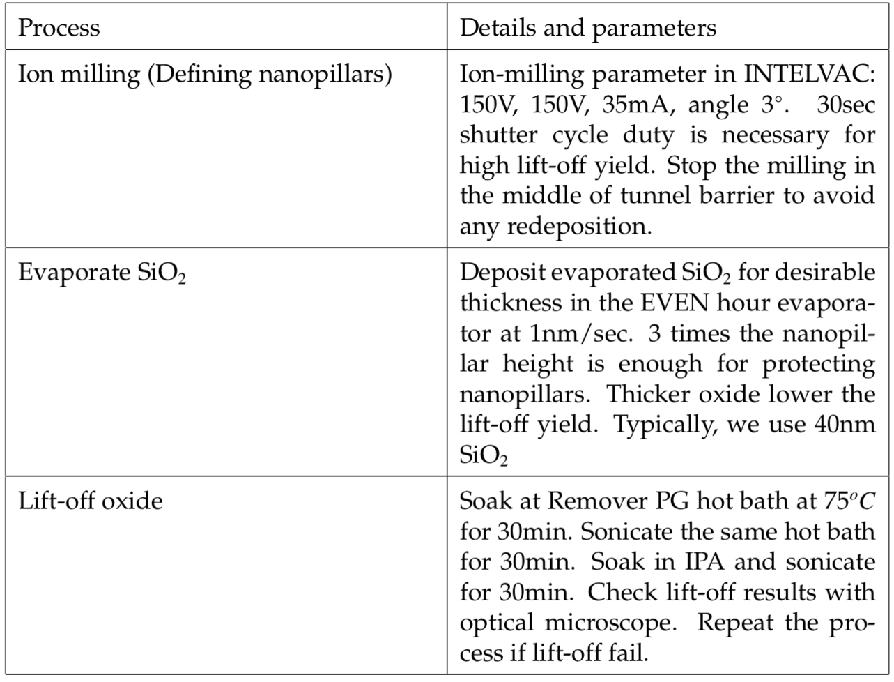 Ion-milling, oxide lift-off는 frabrication에 있어서 매우 중요한 과정이다. 이는 이 스탭들이 fabrication 공정에 있어서 되돌릴 수 없는 과정들이기 때문이다. 만약 한개의 잘못된 parameters가 이 과정에서 사용될 경우, wafer 전체를 폐기해야 할 것이다. 자세한 파라미터들은 Table 4.2.에 요약 해놓았다. 이 섹션에서는, 높은 TMR MgO MTJ fabrication과 관련된 여러 중요한 레퍼런스들러 부터 얻은 실험과 결과들을 설명하려 한다.