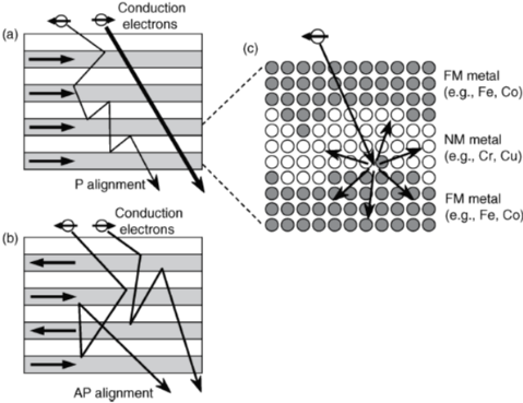 다음을 가정해보자, ferromagnetic layer의 자화방향과 평행한 majority spin을 가지는 전도전자가 그 반대 방향의 스핀(minority spin)을 가지는 전도전자보다 scattering 될 확률이 낮다고 하면, majority spin의 전자들은 scattering없이 더 긴 거리를 이동할 수 있다. 결과적으로, parallel alignment를 가지는 film의 총 전기저항은 antiparallel alignment를 가지는 전기저항보다 더 작게된다. 원칙적으로, 유한한 값의 GMR은 어떠한 FM/NM혹은 합금의 combinations에서 나타날 수 있다. 하지만, 높은 MR ratio는 특정 물질 조합에서만 발생하는데, 해당 조합은 아래와 같다.
