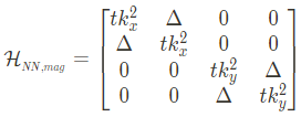 여기서 $t$는 nearest neighbor hopping 파라미터이며, $t'$은 next-nearest neighbor hopping 파라미터이다. 또한 $k_x$와 $k_y$는 각각 x방향과 y방향으로의 모멘텀이며, $\mathbb{I}_p$는 모멘텀 공간(p-space)에서의 identity operator, $\mathbb{I}_s$는 스핀 공간(s-space)에서의 identity operator이다. $\Delta$는 자성에 의해 발현되는 exchange energy이고 $\labmda$는 SOC strength 파라미터이다. 이 중 orbital과 hopping 파라미터에 대한 그림은 아래와 같이 나타낼 수 있다.