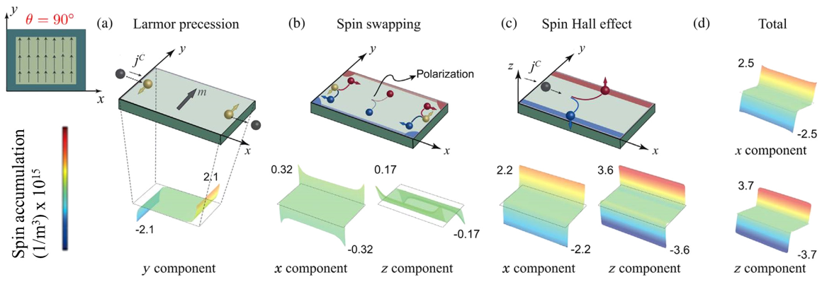 Fig. 7에 나와있듯이, y축으로 자화가 정렬되어 있을 때 전기장이 x방향으로 인가되면, x방향으로 흐르는 전자는 자황에 의해 y방향으로 spin polarization을 갖는다. Spin swapping effect는 y방향으로 흐르면서 x방향으로 spin polarization을 갖는 스핀류를 만들어낸다. 이 스핀류만이 edge 부근에 x축 편광된 스핀축적을 만들어낼 수 있다. 하지만, 자화를 축으로 발생하는 spin precession때문에 x축 편광 뿐만 아니라 z축 편광도 이에 더해 발생할 수 있다. Skew scattering, 그리고 side jump는 z축 편광을 가지면서 y방향으로 흐르는 스핀류를 만들어낸다. 하지만 이 역시 자화를 중심으로 한 spin precession에 의해 x축 편광도 생성해 낼 수 있다. Fig. 7(d)에는 이에 대한 알짜 효과를 나타냈는데, 일반적으로 알려진 spin Hall 방향 (z-component)에 더해 rotated spin orientation (x-component spin)에 의한 스핀 축적도 나타냈다. Note that the competition between dephasing and spin-orbit scattering determines how far from the interface these spin accumulations survive. Strong dephasing could greatly reduce spin swapping effects deep within the bulk of the ferromagnet.