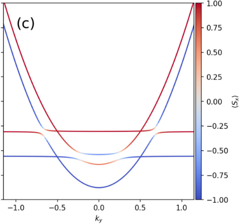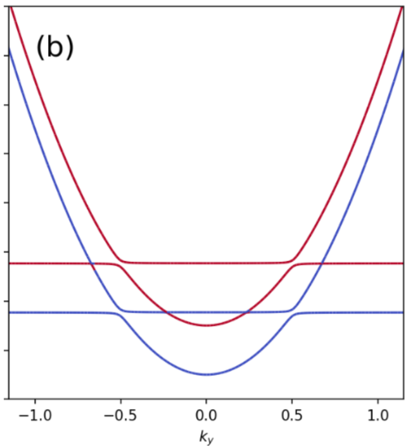이 단순화된 Hamiltonian에 또 다른 항을 추가하는 것은, up-spin 밴드와 down-spin 밴드가 교차하는 degenerate points($E_x^{\pm} = E_y^{\pm}$)를 깨는 것(=avoided crossing)이며, 이는 두가지 경우로 나눌 수 있다. 첫번째 경우는 inter-orbital crossing이라 하며, 두개의 밴드가 서로 같은 spin을 가지고 서로 다른 orbital($k_x =\pm k_y$)을 가지는 지점에서 발생한다. 또 다른 경우로는 inter-spin crossing이라 하며, orbital과 spin이 모두 다른 경우($k_y^2 k_x^2 = \pm 2 \Delta / t$)이다. 이 서로 다른 타입의 crossing을 구분 짓는 것은 spin current가 어디서부터 발생했는지 결정하는데 매우 중요하다. 위의 Hamiltonioan에 항들을 추가할 수록 eigenstates를 구하는 것(diagonalization)은 매우 복잡해지므로, next-nearest neighbor hopping term을 추가 ($t' \ne 0$) 했을 때를 numerically하게 풀어 inter-orbital crossing의 degeneracy를 깰것이다. 이를 통해 시스템은 서로 다른 orbital 사이를 움직임으로써 system의 에너지를 최소화 할 수 있다. Fig 2.1 (b)는 inter-orbital crossing이 gap을 열었을 때를 묘사한다.