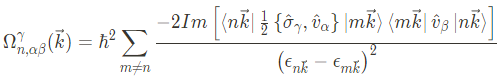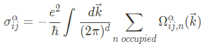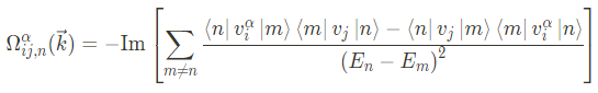 여기서 $i$, $j$는 spatial index, $\alpha$는 spin index를 각각 나타내며, $v_i(\vec{k}) = \partial H / \partial k_i $는 velocity operator, $v_i ^{\alpha} = \cfrac{1}{2} \{ s^{\alpha}, v_i \}$는 generalized spin velocity operator이다. 예를 들어 $\alpha = 0$, $ i =y$, 그리고 $j=x$를 대입하면, 이는 일반적인 Berry curvature 식으로 환원된다.위 식을 이용하여, 우리는 (T = 0 K 에서의) spin Hall conductivity 를 아래와 같이 구할 수 있다. (Berry curvature에서 Hall conductivity를 구하는 과정과 동일!)