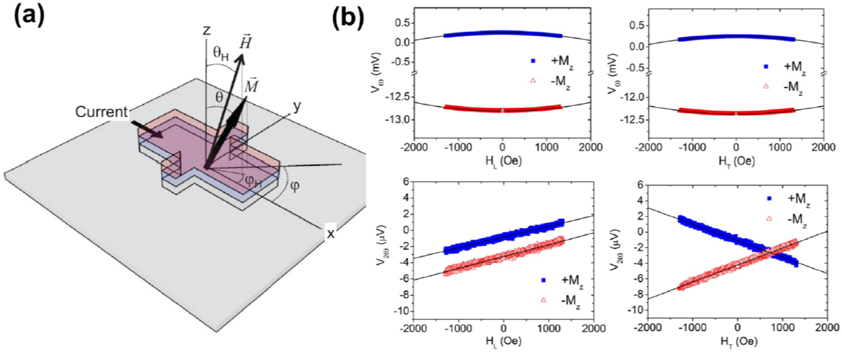 Fig. 8(a)에서 보이는 것과 같이, $H_{ext}$는 xy plane내에서 회전하는 360° sweep을 하며, 이를 통해 second harmonic voltage $V_{2\omega}(\phi)$의 angle dependence를 얻을 수 있으며, 아래와 같은 식으로 fitting 할 수 있다.