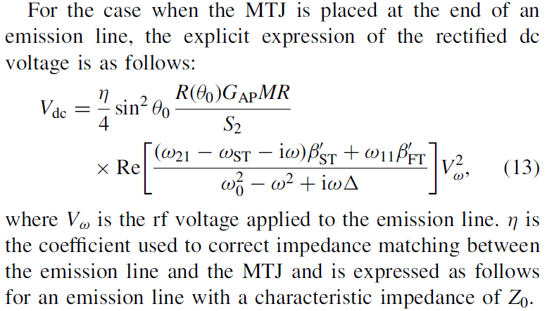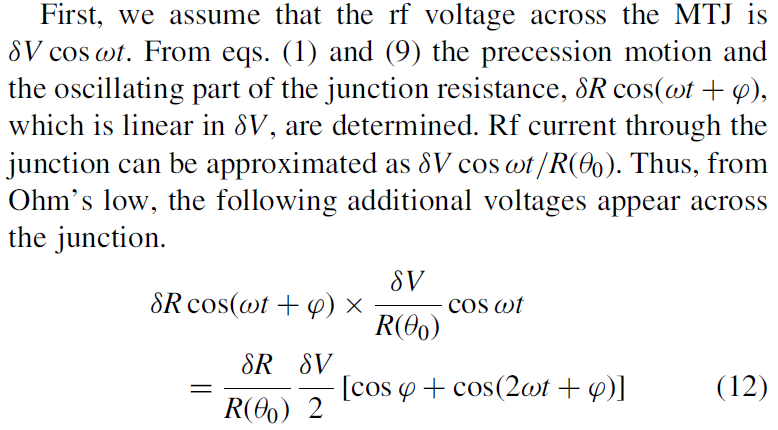 2005년 Tulapurkar 연구팀은 MTJ에서 spin-torque diode effect와 관련된 논문을 발표하였다. 해당 논문에서 tunnel device를 고안하여 spin-polarized microwave 전류가 STT와 TMR때문에 recified voltage로 변환 되게 끔 하였다. (see Fig. 5.2 for a schematic illustration of the spin-torque diode effect).