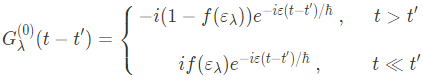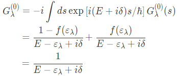 여기서 $\langle0| a_\lambda^\dagger a_\lambda|0\rangle$은 state $\lambda$의 particle number이며 zero-temperature Fermi distribution function $f(\varepsilon_lambda)$로 볼 수 있다. 이를 이용해 다시 Green's function을 쓰면