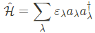 여기서 $\varepsilon_\lambda$는 $\lambda$ state의 eigenenergy이며, 전자의 momentum과 spin space를 특정시킨다. $a_\lambda^\dagger$, $a_\lambda$는 fermion의 creation, annihilation opeator이다.