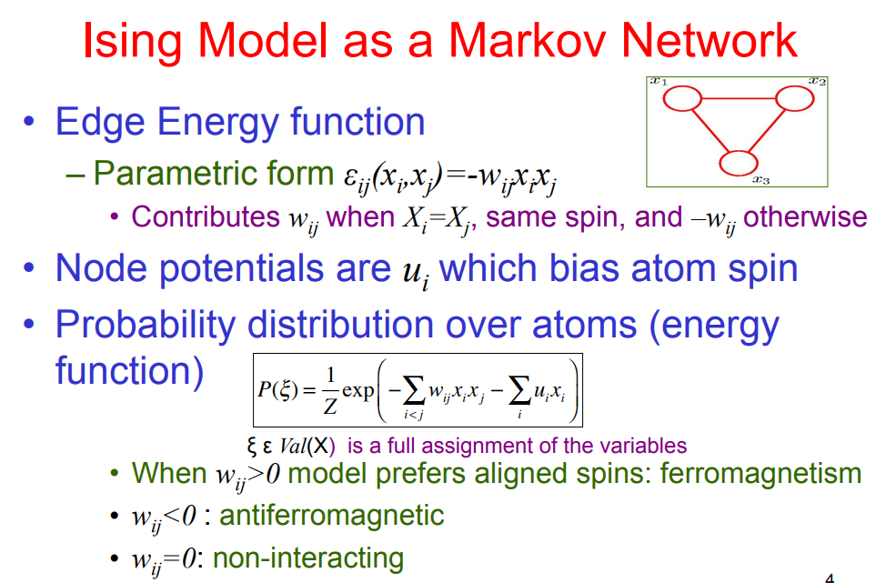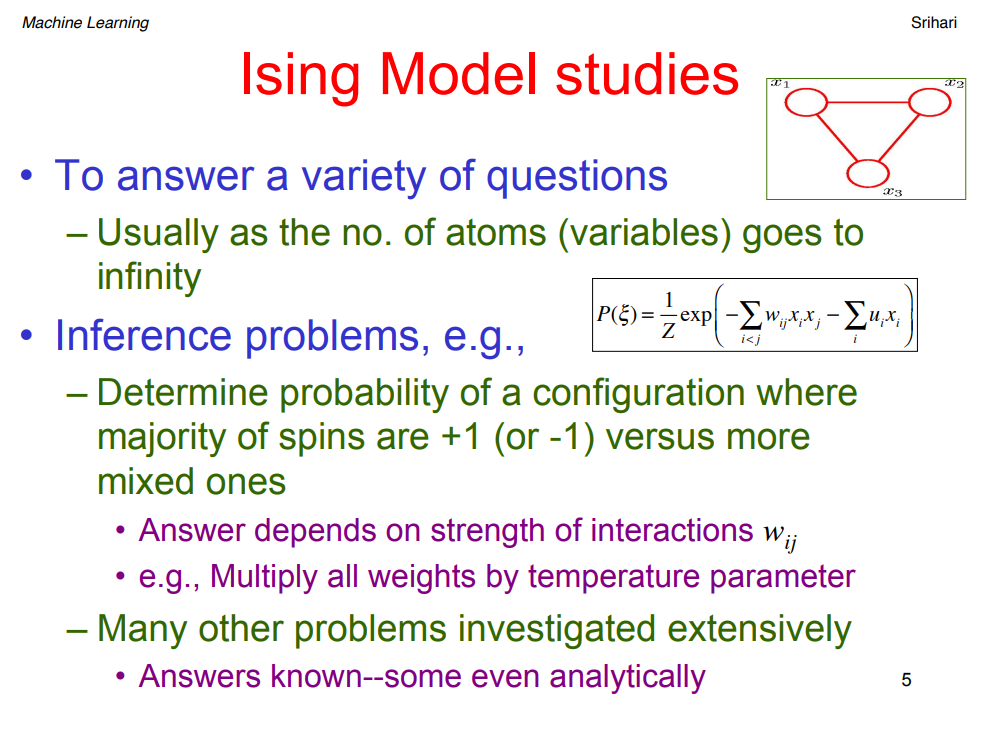 Hopfiled' model (Ising model)의 경우, binary-valued states를 가진다. 즉, 그들은 "on", 또는 "off" 둘 중 하나를 가지면 이 때 connection은 bidirectional 하다. Boltzmann Machine의 connection의 강도(edge weight)는 can be considered as the desirability that the units incident with this connection are both "on".