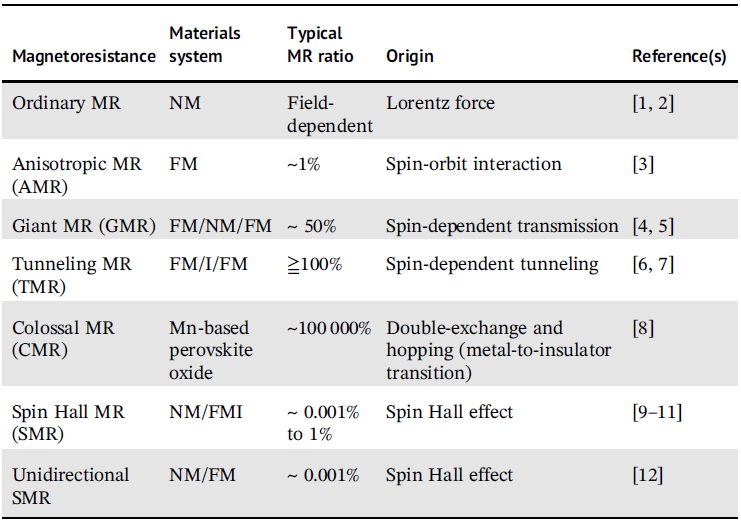 | Magnetoresistance | Materials System | Typical MR ratio | Origin |