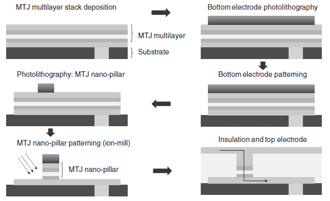 실제 메모리 응용면에서, MTJ(CPP configuration) 공정은 Figure 4.7.과 나와있다 싶이 전형적인 BEOL(back end of line) CMOS 기술을 기반으로 한다. 이는 일반적으로 sputtering system에 의한 MTJ layer stack deposition으로부터 시작하며, photolithography와 후속 etching steps등을 거쳐 nanopillar 모양의 MTJ devices를 정의한다. 하지만 추가적인 노력들이 산업적인 레벨의 표준을 맞추기 위해 MTJ를 공정하는데 있어 필요하다. 예를 들어, 높은 퀄리티의 MgO tunnel barrier를 포함한 다층박막을 증착하는 것과, ferromagnetic layer의 crystallization을 matching하는 것을 컨트롤 하는 것은 자성층의 높은 TMR ratio와 강한 PMA를 얻는데 매우 중요하다. 이 목표를 이루기 위해, 진보된 스퍼터가 개발되어야 한다. 리소그래피와 이어지는 ion milling(etching/patterning) 과정 역시 나노스케일에서 높은 수율과 높은 TMR의 MTJ를 획득하는데 매우 중요하다.