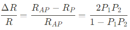 $\cfrac{\Delta R}{R} = \cfrac{R_{AP}-R_{P}}{R_{AP}}= \cfrac{2P_{1}P_{2}}{1-P_{1}P_{2}}$