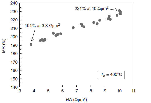 후의 챕터에서, 우리는 이 p-MTJ memory device의 writing mechanism을 소개할것이다. 이 메커니즘은 current-induced spin transfer torque 법칙을 기반으로 하며 이를 통해 CoFeB의 자화를 스위칭한다. CoFeB 자화를 바꾸는데 필요한 switching current를 줄이기 위해, resistance area (줄여서 RA라고 부르며, 터널 배리어의 두께와 근본적으로 상응한다.) 는 작으면 작을술고 좋다. 하지만 RA를 줄이는 것은 TMR의 퀄리티를 낮추낟. 최근의 연구적 노력들은 이 두 factor상의 trade-off limit을 한 차원 늘리는데 공을 들이고 있다. 예를 들어 Figure 4.10처럼 200%의 TMR ratio를 가지면서 5$\Ohm \mu m^{2}$의 RA를 가지는 경우를 말한다. 더 높은 TMR ratio와 상대적으로 낮은 RA를 가지는 것이 차세대 MRAM의 핵심 개발 열쇠라고 할 수 있을 것이다.