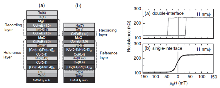 현대의 MTJ는 일반적으로 터널배리어로서 MgO를 이용한다. CoFeB 강자성체 합금 레이어는 일반적으로 FM 전극에 사용된다. Ta와 같은, 적절한 buffer layer를 이용하여 Ikeda 연구팀은 2010년 Ta/CoFeB/MgO heterostructure가 annealing 이후에 품질이 괜찮은 PMA를 얻을 수 있다는 것을 보였다. 이때 CoFeB 레이어의 두께는 1nm 정도로 매우 얇았다.
