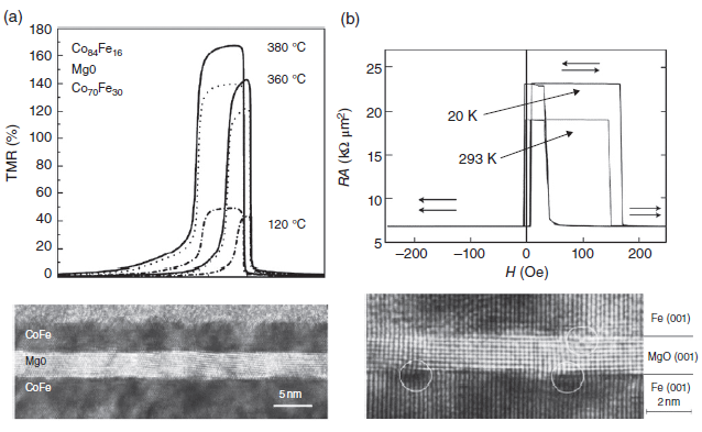 2004년에, 또 다른 패러다임의 변화가 발견되었는데, 이는 상온에서 200%에 가까운 TMR이 MgO-기반의 MTJ에서 발견되었기 때문이다. 이는 sputtering technique를 이용한 Parkin 연구진과 epitaxial growth를 이용한 Yuasa 연구진에 의해 발견되었다.(Figure 4.6을 확인한다). 비록 2001년에 여러 이론적인 연구들이 MgO-기반의 MTJ에서 높은 TMR을 예측했지만, 높은 TMR을 구현하는 것은 Fe(001)/MgO(001)의 lattic match를 물질 성장에 있어서 잘 컨트롤 함을 요구한다.