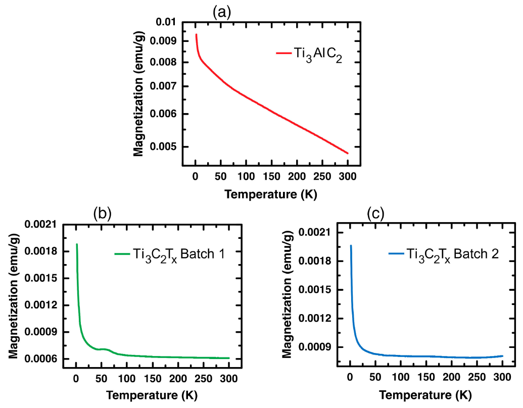 위 그래프를 보면 70 K 부근에서 antiferromagnetic-like cusp가 존재하는데, 이는 paramagnetic-antiferromagnetic(PM-AFM) phase transition이 나타남을 알려준다. Al을 더 철저히 제거한 Batch 2의 경우, cusp는 더 높은 Neel temperature로 이동한다. 흥미롭게도, 2K에서 에칭된 두 샘플 batch 모두 $Ti_3 Al C2$에 비해 magnetization의 크기가 1/5 밖에 되지 않았다. 이러한 결과는 서로 다른 magnetic behavior, 또는 magnetic phase transition이 etching되지 않고 남아있는 Al에 의한 것임을 짐작 할 수 있다. 특히, etching되지 않은 $\mathrm{Ti}_3 \mathrm{Al} \mathrm{C}_2$의 FM behavior는 Al에 의해 중재되며, 더욱이 near-surface region에 위치한 Al에 의해 중재된다. Etching이 진행 된 이후, $\mathrm{Ti}_3 \mathrm{Al} \mathrm{C}_2$는 $\mathrm{Ti}_3 \mathrm{C}_2 \mathrm{T}_x$로 변화하며 더욱 적은 양의 $\mathrm{Al}$을 갖게되며, 여기서 $\mathrm{Al}^{3+}$는 $\mathrm{Ti}_3 \mathrm{C}_2 \mathrm{T}_x$ MXene에서 복잡한 PM-AFM 행동을 유발하는 self-dopant로서 행동한다. 이 설명은 최근 보고된 $\mathrm{La}^{3+}$-doped $\mathrm{Ti}_3 \mathrm{C}_2 \mathrm{T}_x$(여기서 $\mathrm{La}^{3+}$ ion들은 MXene 표면에 흡착된다.) 에서 발견되는 AFM 행동과도 일치한다.