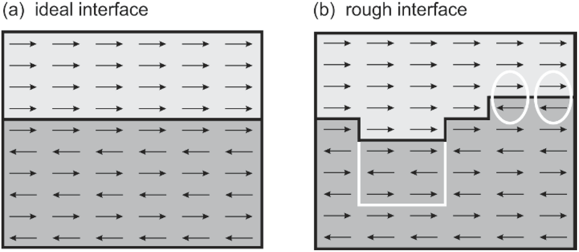 실제의 계면이 자성 특성에 끼치는 영향은 아래 Fig 14.11 처럼 반자성 기판위에 강자성 박막이 올라간 경우를 예로 들어 설명하겠다. 우선 왼쪽 그림처럼 이상적인 계면에서 ferromagnetic coupling이 발생함을 가정하면, 6개의 uncompensated 스핀이 반자성체의 스핀을 따라 발생한다. 하지만 실졔 계면에은 이상적인 계면처럼 평탄하지 않다. 실제 계면의 roughness는 강자성체와 반자성체가 서로 반대방향을 향하는 상황을 만들어내며, 전체 면적에서 ferromagnetic coupling이 발생하는 것을 방해한다. 대표적으로 frustration(동그라미), 또는 domain wall(박스)이 발생하여 uncompensated spin의 숫자를 줄여버린다.