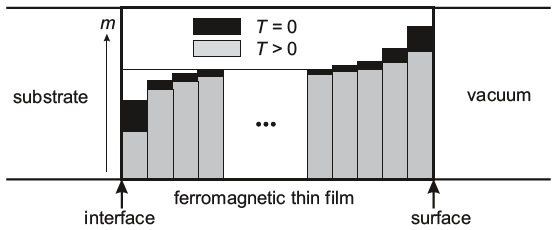 얇은 박막에서의 자화는 필름 내의 consant magnetic moments에 의해 특정되어진다. 하지만 박막의 양쪽 계면에 의해 deviation이 발생한다. 박막과 기판 사이의 계면에서 원자들의 electronic states의 hybridization이 발생하고, 결과적으로 magnetic moments의 감소로 이어진다. 표면은 증가된 magnetization을 보이는데, 이는 coordination number의 감소 때문이다. (예를 들어, atomic-like behavior가 우세하다). 온도가 증가함에 따라 박막 전체에 자화가 감소하는 경향을 보인다. 이 경향은 박막의 안쪽 layer보다는 계면과 표면에서 더 크게 발생한다. 중요한 파라미터는 역시 박막의 두께일 것이다. 이것이 anisotropy, Curie temperature, (spin dependent) transport properties, 그리고 quantum well등에 어떠한 영향을 끼치는지 의논해보고자 한다.