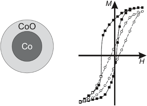 CoO가 코팅된 Co 입자들은 우선 첫번째로 상온에서부터 77 K까지 외부 자기장이 없는 상태에서 쿨다운 됐다. 이에 따른 hyseresis loop (dashed line으로 그려진 것)는 y축에 대해 대칭적이었다. 그 다음으로, 강한 자기장을 걸은 상태(이른바 field cooling)에서 77 K까지 쿨다운 시키면, hysteresis loop은 왼쪽으로 치우치게 된다.