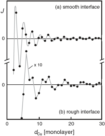 이 RKKY 상호작용에 대한 계산은 Fig 15.3과 같이 Co/Cu 시스템에 대해 깔끔한 표면과 거친 표면에서 어떻게 되는지 예제로서 나와있다. Figure 15.3(a)는 크고 짧은 주기의 진동을 보여주며shows
