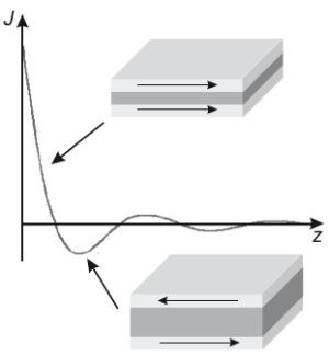 이 의존성은 비자성 interlayer에 의해 분리된 자성 박막에 따라 달라진다. interlayer의 두께를 z라 하면, exchange coupling constant는 다음과 같은 경향성을 보인다: