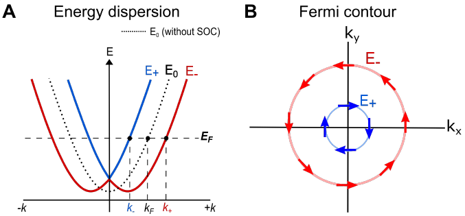 $E_{+}$와 $E_{-}$의 energy splitting은 Fig.2.2a에 나와있다. 이 figure에서, $E_0$는 SOC가 부재할 때의 degenerated energy band를 나타낸다. Fermi energy $E_F$에서 각각의 Fermi contour(effective magnetic field의 방향과 평행)는 Fig.2.2b에 나와있다.