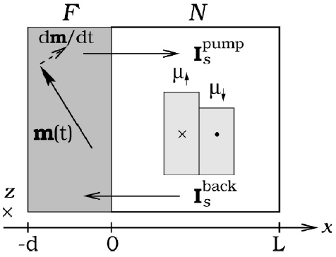 위 식에서 $D$는 전도 전자의 diffusion coefficient이고, $\tau_{sf}$는 NM1에서의 spin-flip time이다. 여기서 우리는 $\vec{\mu}_1^s$의 세차 운동 주파수 $\omega$에 대해서 $\omega \tau_{sf} \gg 1$임을 가정할 것이다.