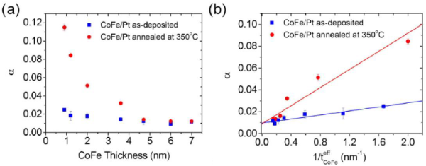 Spin torque에 더해, magnetic damping 측정 역시 interfacial transparency에 대한 중요한 정보를 알려준다. 위 figure는 annealing 이전과 이후에 CoFe/Pt의 magnetic damping 측정 결과를 보여준다. Fig.(a)에 나와있듯이, annealing 이전과 이후 모두에서 $t_{\mathrm{CoFe}}$가 감소함에 따라 magnetic damping $\alpha$가 증가하는 결과를 보였다.