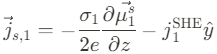 그러므로, NM1에서 발생하는 SHE는 아래와 같은 스핀류 $j_1^{SHE}$를 만들어낼 것이다: (아래 식에서 벡터는 spin polarization 방향이다)