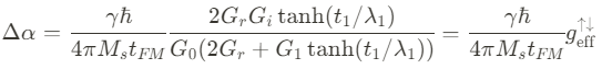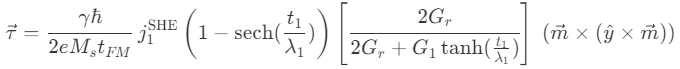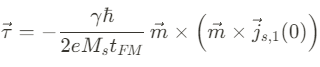 위 방정식에서 $G_1 = \sigma_1/\labmda_1$이다. 위의 spin current는 두께 $t_{FM}$을 가지는 FM으로 injection 되어 자화에 torque를 작용시키는데, 이때 값은 아래와 같다.