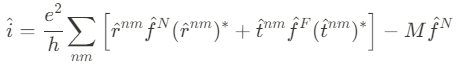 위 식에서 $\hat{f}^N(F)$는 NM(FM)에서의 Fermi distribution이며, M은 propagating channel, 그리고 $\hat{r}$, $\hat{t}$는 각각 reflection matrix, tansmission matrix이다.