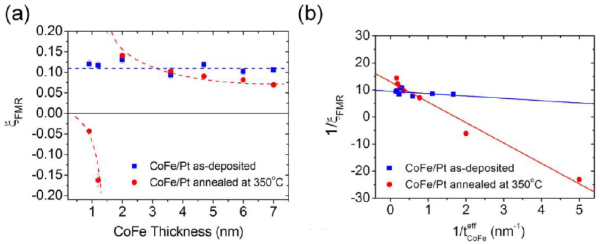 위 그림은 CoFe/Pt 시편에서 ST-FMR 측정 결과를 보여준다. 그림과 같이 as-grown CoFe/Pt 샘플에서는, spin torque efficiency $\xi_{FMR}$는 $0.1$ 정도의 값을 가지며 $t_{\mathrm{CoFe}}$의 변화에 따라 크게 바ㅏ뀌지 않는다. 이는 다시 말해 effective field like com[onent가 이 샘플에서는 거의 미미 하다는 것($\xi_{FL} \sim 0$)을 보여준다. 다른 한편으로 annealed CoFe/Pt 샘플에서는 $\xi_{FMR}$값이 $t_{\mathrm{CoFe}}$에 명확하게 의존하는 값을 가지며 $\xi_{FL}$이 0이 아닌 값을 가짐을 알 수 있다. 또한 $t_{\mathrm{CoFe}}= 2nm$에서 $\xi_{FMR}$의 부호가 바뀌는 것은 ST-FMR의 antisymmetric component의 부호가 바뀌는 것과 연관되며, field-like spin-orbit torque와 Oersted torque의 부호가 서로 반대임을 나타낸다.