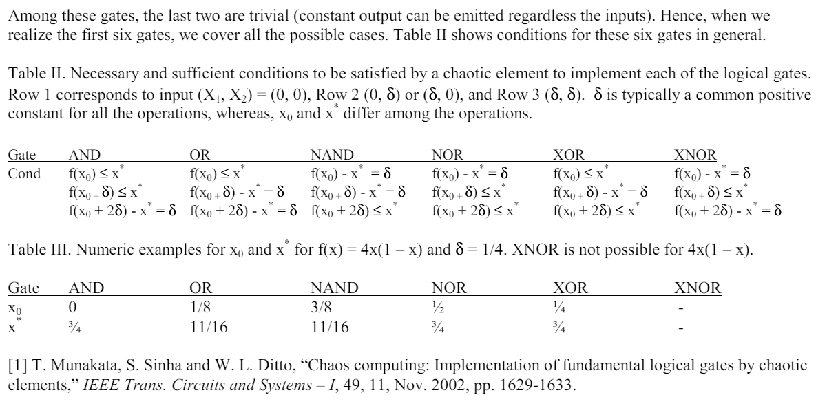 In this case, the value of x is chaotic when r >~ 3.57... and rapidly switches between different patterns in the value of x as one iterates the value of n. A simple threshold controller can control or direct the chaotic map or system to produce one of many patterns. The controller basically sets a threshold on the map such that if the iteration ("chaotic update") of the map takes on a value of x that lies above a given threshold value, x*, then the output corresponds to a 1, otherwise it corresponds to a 0. One can then reverse engineer the chaotic map to establish a lookup table of thresholds that robustly produce any of the logic gate operations.[1][2][3] Since the system is chaotic, we can then switch between various gates ("patterns") exponentially fast.
