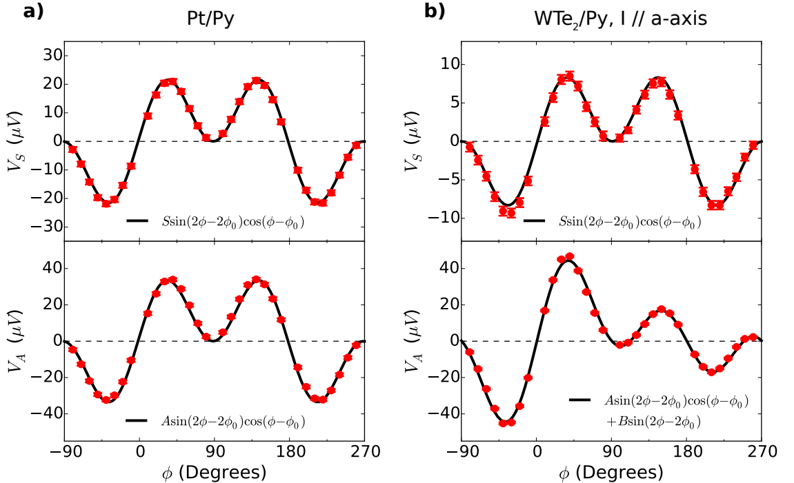 하지만, 더 주목할 점은 antisymmetric compnent의 angular dependence이다. 일반적인 $\cos \phi \sin 2\phi$ 형태와 매우 다르며, 이 signal amplitude의 변화는 WTe2 surface의 broken symemtry를 반영한다. This result indicates the existence of a source of out-of-plane torque not previously observed in any S-O torque experiment