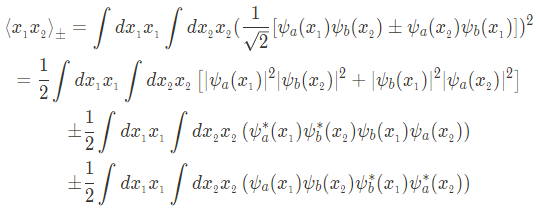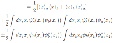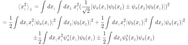 전자 1이 $\psi_a (x)$ state에, 또 다른 전자 2가 $\psi_b (x)$ state에 있고, 두 states가 서로 orthogonal 하며, 각각이 normalized 됐을 때, 두 입자사이의 거리제곱 $(x_1-x_2)^2$의 expectation value를 구해보면,