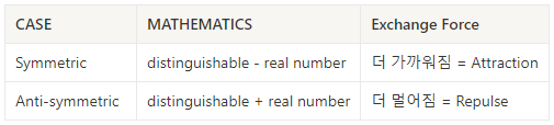 ☞ Exchange force는 symmetrization 조건에 의한 순수 기하학적 결과이다. 또한 이는 명백하게 양자역학적 현상이며, 고전역학적 counterpart는 존재하지 않습니다.