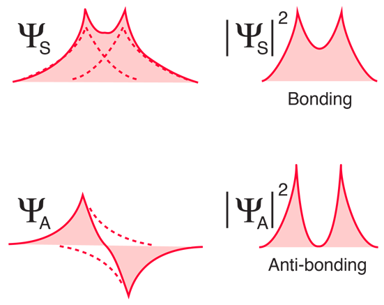 교환 상호작용을 가장 직관적으로 볼 수 있는 예가 바로 수소 분자 $H_2$입니다. 수소 양성자 주변의 전자 분포는 양자역학적 파동함수로 나타낼 수 있습니다. 파동함수는 각 원자들이 가직 있는 전자를 설명하며, identical electrons의 exhcnage에 따라 spatial part가 symmetric이 될 수도 있고 antisymmetric할 수도 있습니다. 하지만 Pauli exclusion principle에 따르면, 우리는 두개의 동일한 페르미온은 반드시 totally antisymmetric 이어야 한다는 것을 알 수 있다.