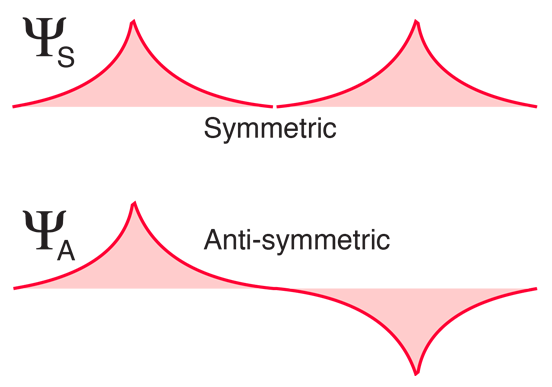 아래와 같이, 수소 원자들이 서로 붙을 때, symmetric spatial wavefunction은 전자의 bonding configuration을 유발하고, antisymmetric 의 경우에는 그렇지 않다. 실제 전하 밀도는 전자 파동함수의 제곱으로 나타나지므로, symmetric wavefunction이 핵 사이에서 더 높은 전자 밀도를 가지게 되며 atom 사이의 인력을 유발한다. $ \rightarrow $ bonding 형성