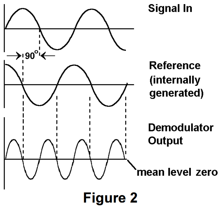 The demodulator operates by multiplying these two signals together to yield the signal identified in the diagram as “Demodulator Output”. Since there is no relative phase-shift between the signal and reference phases, the demodulator output takes the form of a sinusoid at twice the reference frequency, but with a mean, or average, level which is positive.